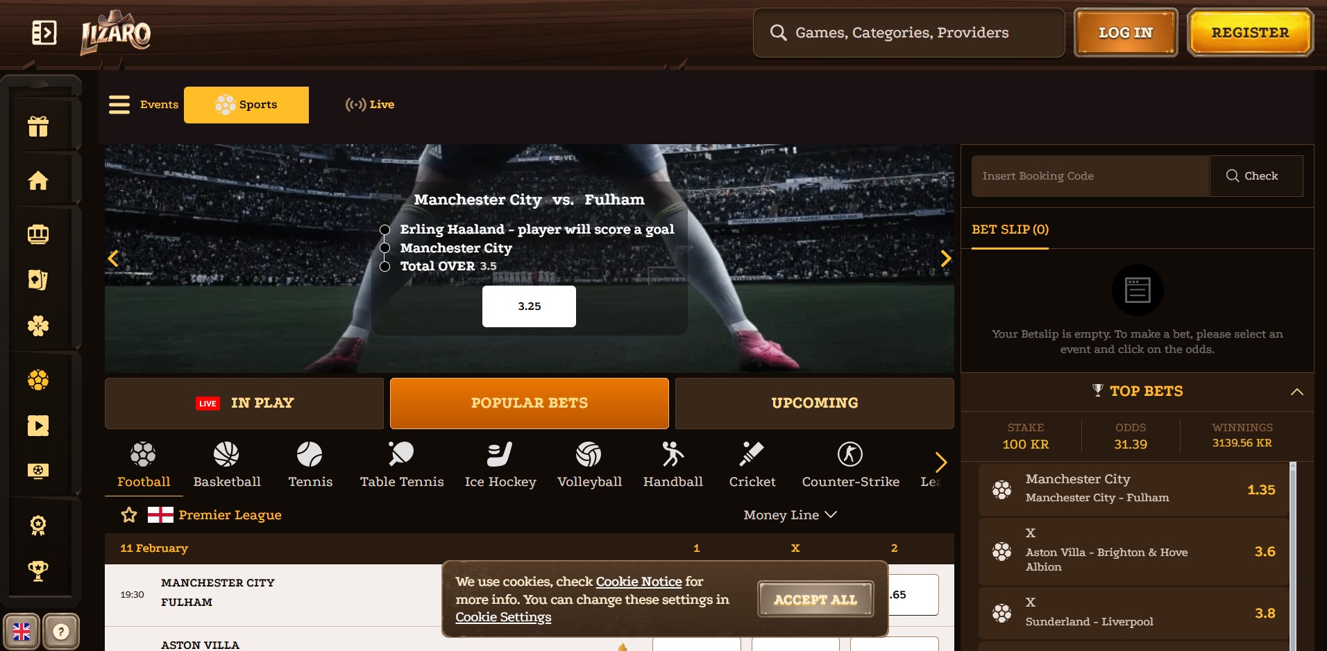 Lizaro is not just a casino with a sports bolt-on; the betting platform is a fully fleshed-out product. It covers over 30 sports, ranging from the absolute staples like Football and Horse Racing to niche interests like Futsal and Gaelic Hurling.